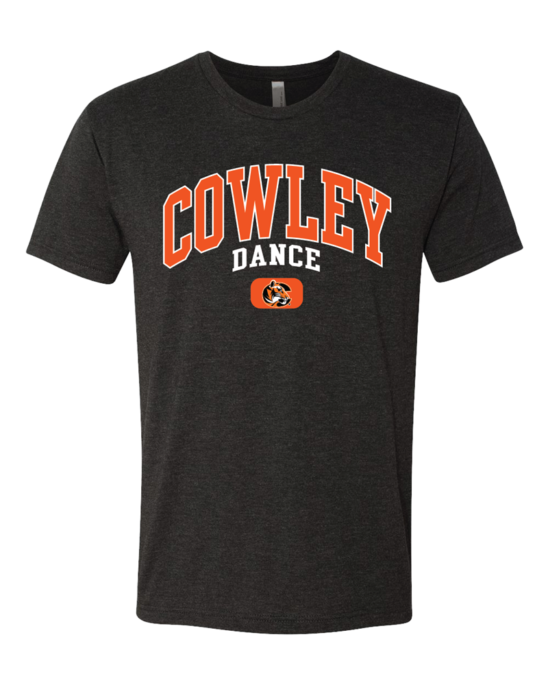 A signature blended style from Tobacco Road Tees, this super-soft crew is instantly loved by all who wear it. These comfortable tri-blend t-shirts are made from polyester, combed and ring spun cotton, and rayon. Decorated with Cowley arched with dance below and our tiger logo full chest screen imprint. Preshrunk 50% polyester/25% cotton/25% rayon jersey 4.3-oz