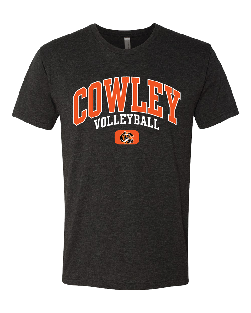 A signature blended style from Tobacco Road Tees, this super-soft crew is instantly loved by all who wear it. These comfortable tri-blend t-shirts are made from polyester, combed and ring spun cotton, and rayon. Decorated with Cowley arched with volleyball below and our tiger logo full chest screen imprint. Preshrunk 50% polyester/25% cotton/25% rayon jersey 4.3-oz