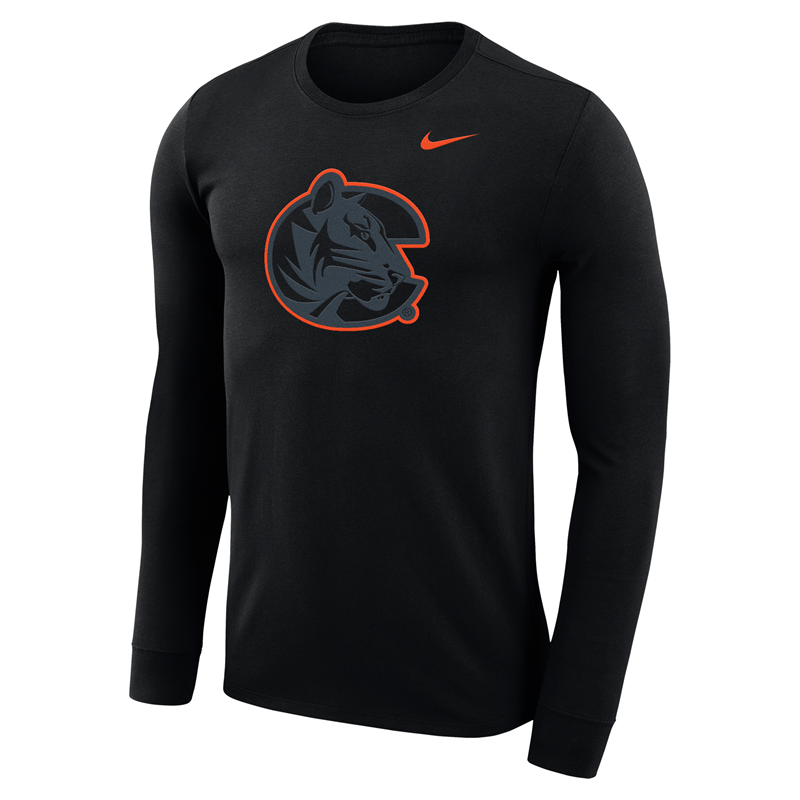 This Nike Dri-fit long sleeve tee has fabric that wicks sweat and moisture away so you stay cool and comfortable. Class long sleeve crew silhouette with ribbed neckband for performance comfort. Decorated with our Tiger logo in black and charcoal outlined in orange screen print. 100% recycled Polyester