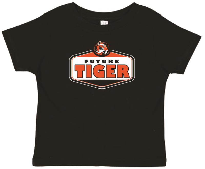 Every kid can be a future Tiger in this toddler black tshirt. Decorated with our Tiger logo, future tiger inside a diamond shape screen print. 100% Ring Spun Cotton (Cotton Poly blend)