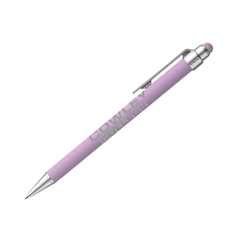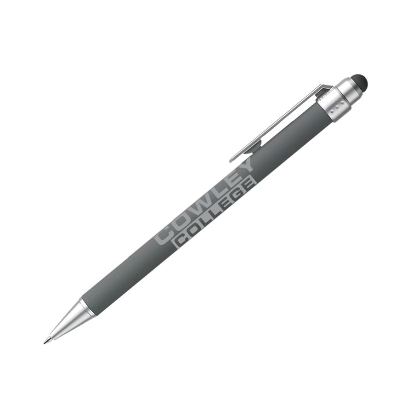 Retractable stylus pen with soft touch barrel and silver accents. Slide down pen clip to retract pen tip. Decorated with Cowley College in a grey imprint. Medium point.