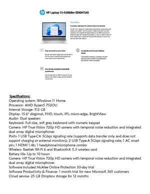 Specifications: Operating system- Windows 11 Home Processor- AMD Ryzen5 752OU Internal Storage- 512 GB Display- 15.6" diagonal, FHD, touch, IPS, micro-edge, BrightView Audio- Dual speakers Keyboard- Full-size, soft grey keyboard with numeric keypad Camera- HP True Vision 720p HD camera with temporal noise reduction and integrated dual array digital microphones Ports- 1 USB Type-C® 5Gbps signaling rate (supports data transfer only and does not support charging or external monitors); 2 USB Type-A 5Gbps signaling rate; 1 AC smart pin; 1 HDMI 1.4b; 1 headphone/microphone combo Wireless- Realtek Wi-Fi 6 and Bluetooth® 5.3 wireless card Battery life- Up to 10 hours Camera- HP True Vision 720p HD camera with temporal noise reduction and integrated dual array digital microphones Software included McAfee Online Protection 30-day trial Software Productivity & Finance- 1 month trial for new Microsoft 365 customers Cloud service- 25 GB Dropbox storage for 12 months